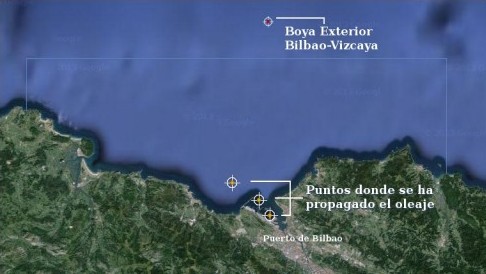 Posiciones de una boya de Puertos del Estado y los puntos de propagación en el Puerto de Bilbao.